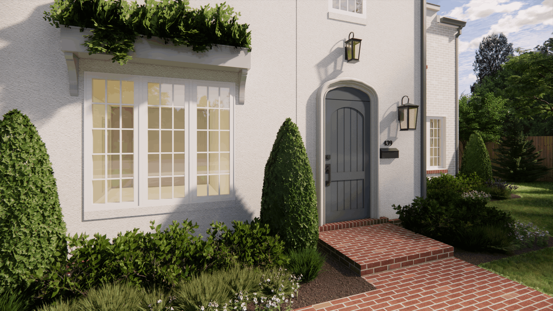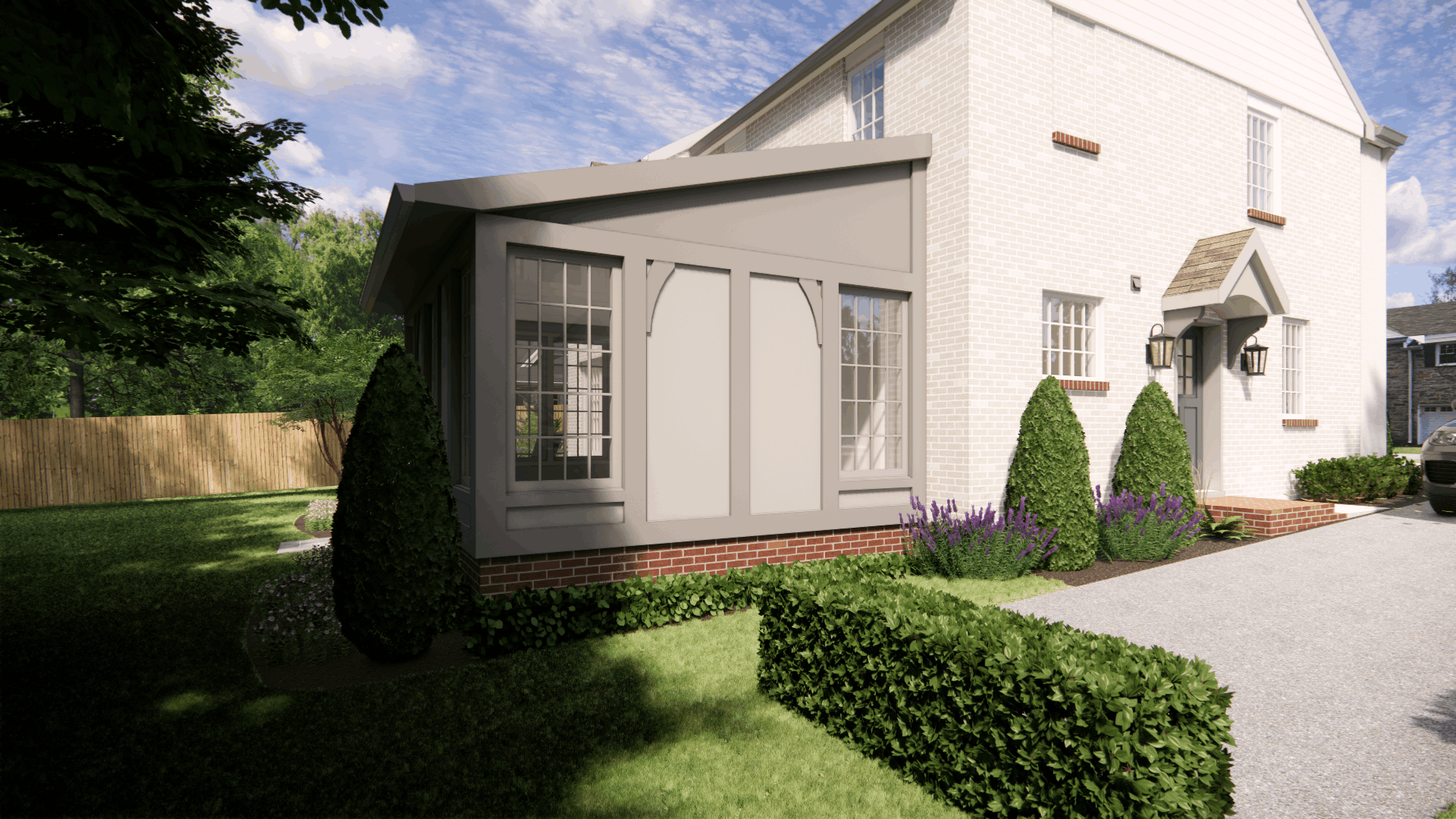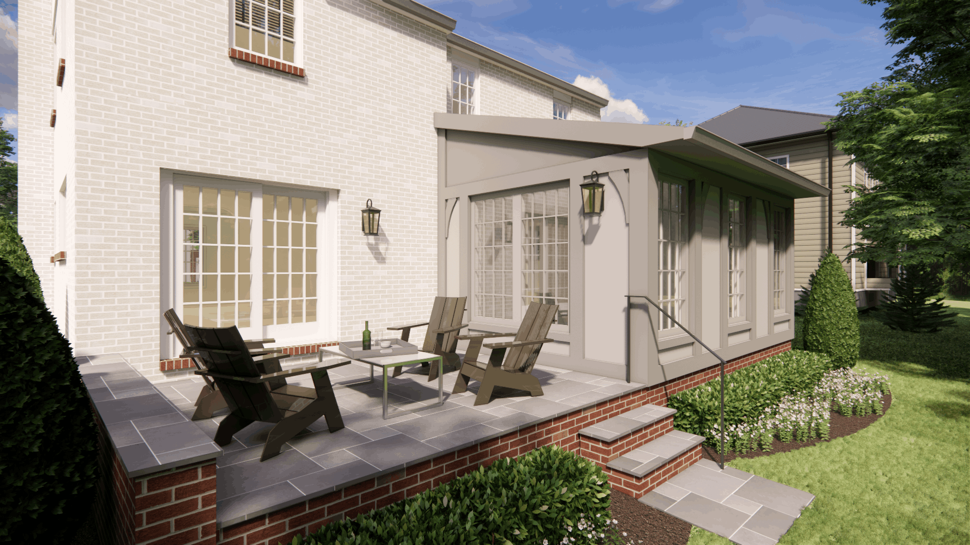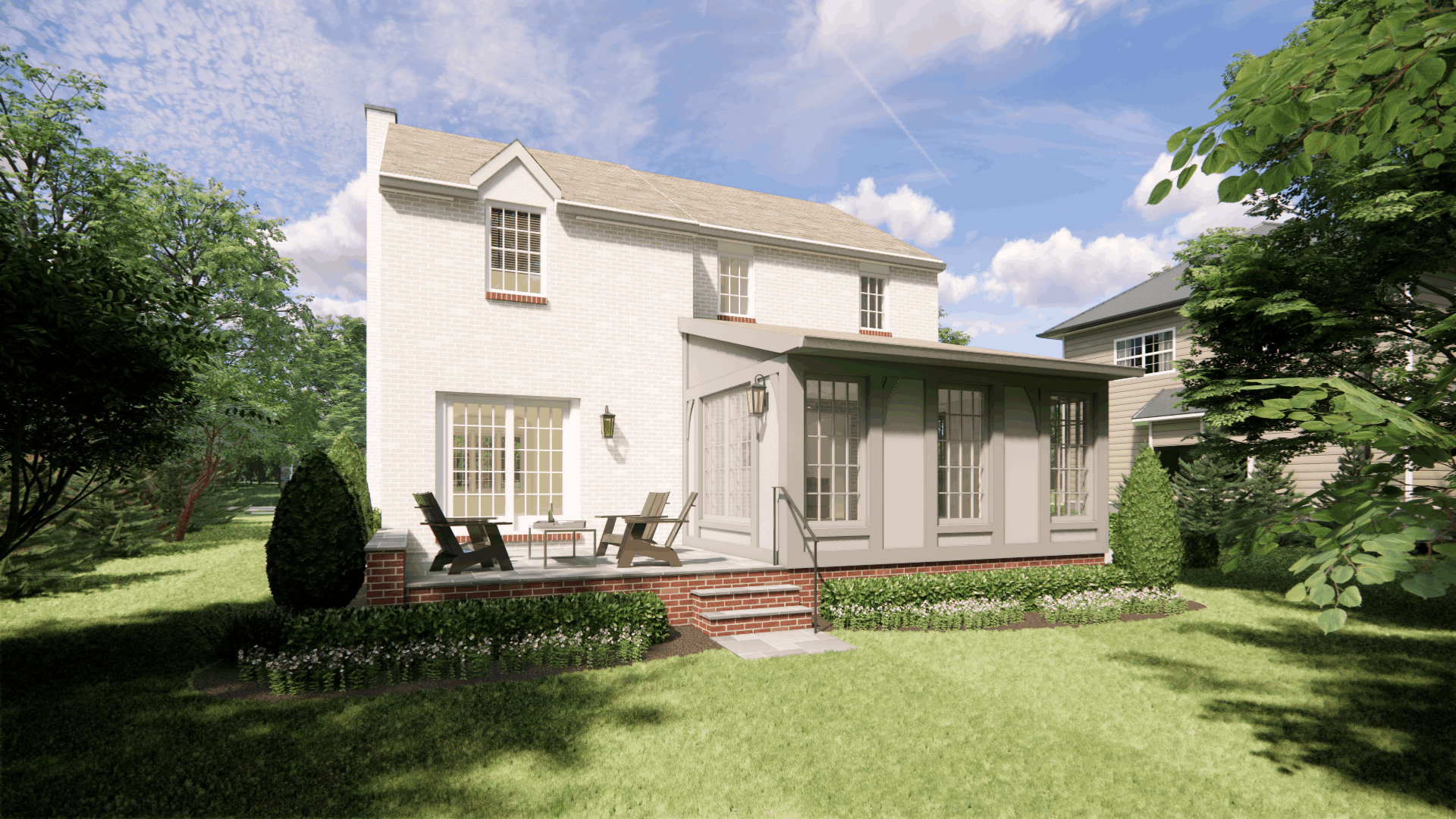 The existing screened porch was enclosed as conditioned living space, and the back patio was redesigned to harmonize with the English Cottage aesthetic, creating outdoor areas that complement the interior. Thoughtful attention to proportion, materials, and detailing throughout the home ensures a cohesive transformation, balancing modern functionality with historic charm and enhancing the overall street presence.