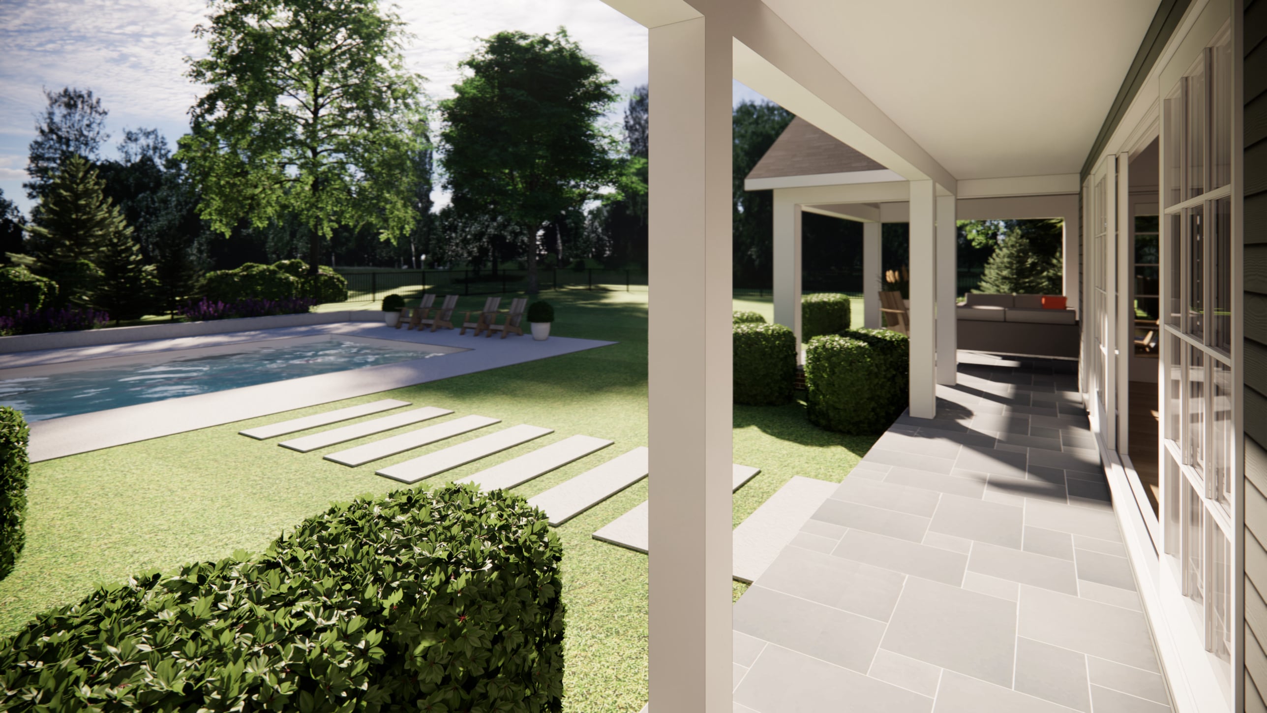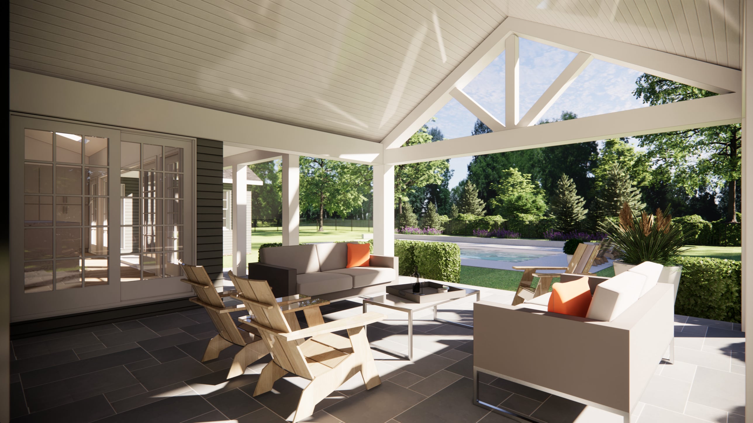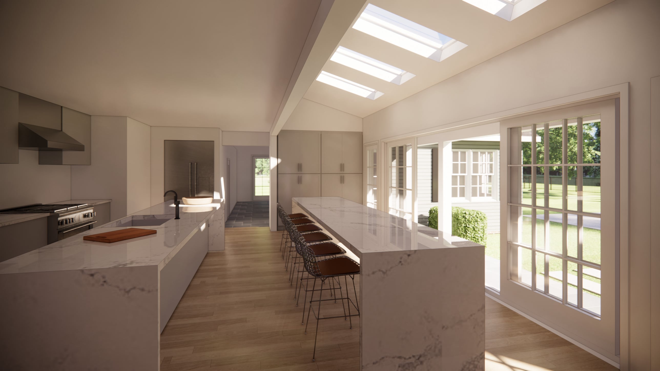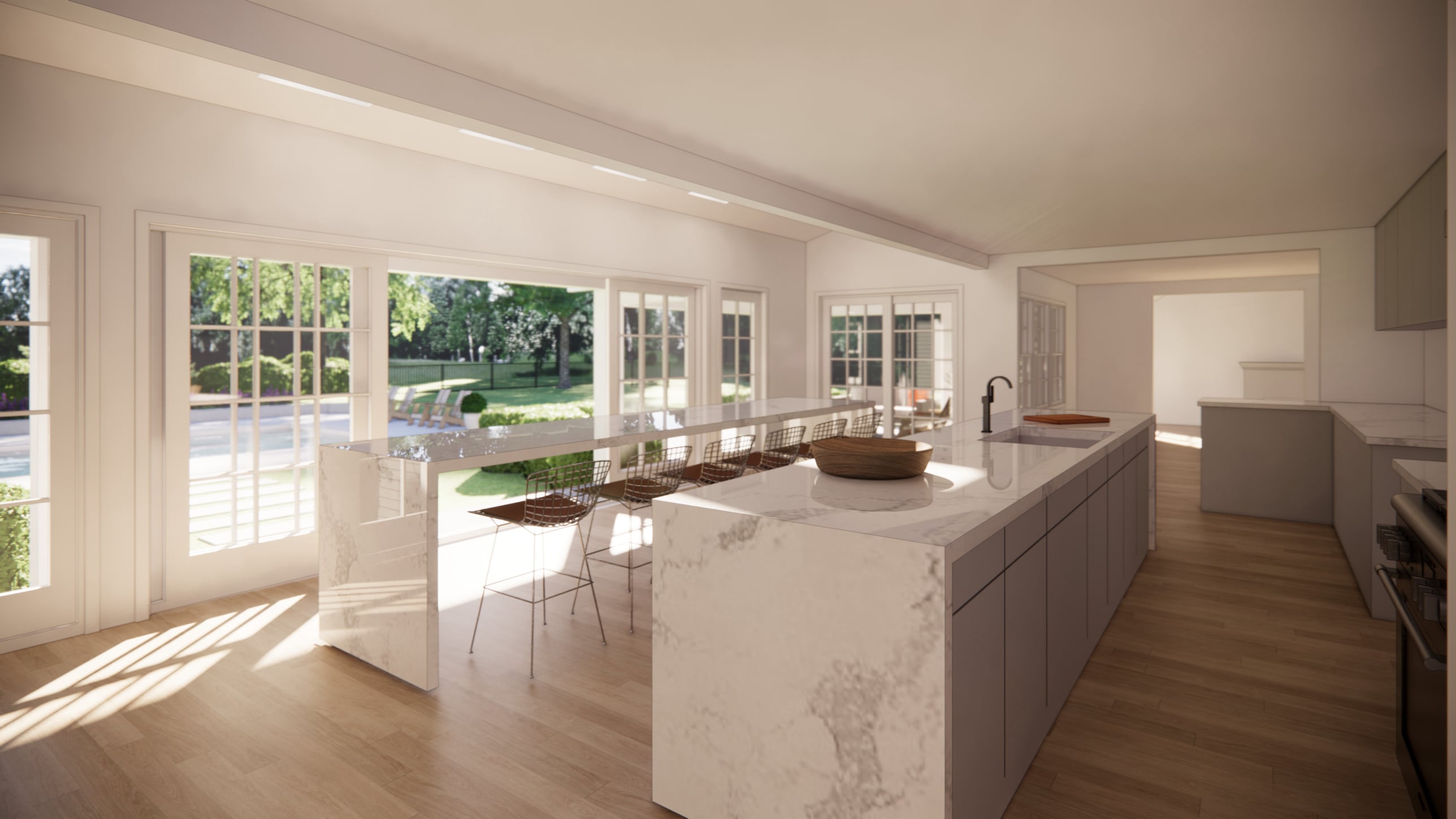 The kitchen and existing family room also feature large sliding doors, enhancing views and access to the existing pool and park-like backyard and integrating the home with its outdoor areas. Thoughtful attention to layout, sightlines, and connectivity ensures a design that balances family function with a strong connection to the landscape.